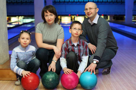 Family from four persons of squatting in club for bowling and holds on to balls, focus on children and balls