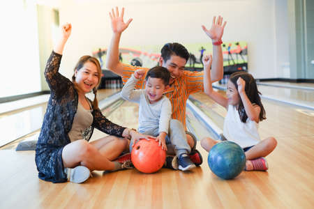 group of happiness asian family father, mother, son and daughter playing bowling in sport club with happy smiling face during holiday vacation