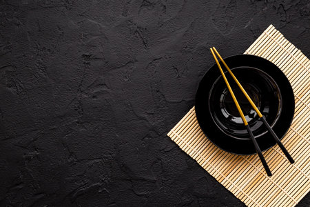 Chopsticks on empty bowl, bamboo sushi rolling mat and steamer on gray concrete countertop. Oriental kitchenware flat lay composition.