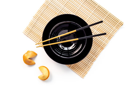 Fortune cookies and golden chopsticks. Asian style tabble setting