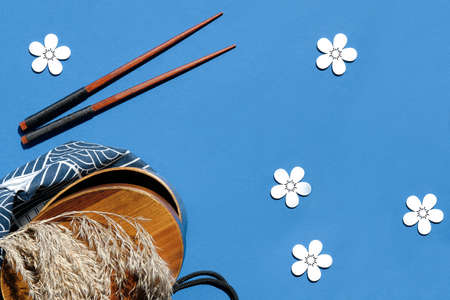 Zero waste packed lunch box set on blue paper background, deco flowers. Lunch box with wooden chopsticks on furoshiki textile cloth. Flat lay, top view on paper.