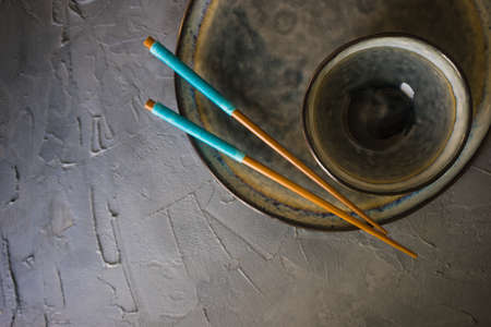 Rustic table setting with ceramic plate and bowl and wooden chopsticks
