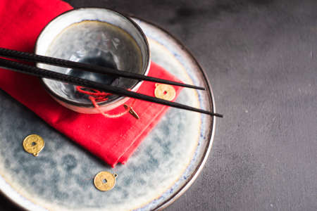 Rustic table setting with chopsticks for dinner in asian style on dark wooden table with copyspace