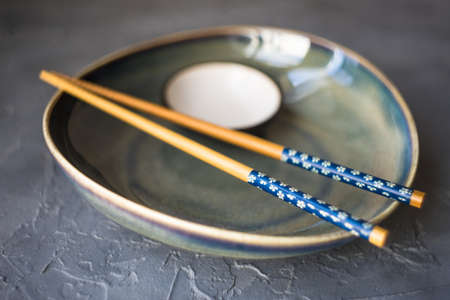 An empty blue ceramic rice bowl on a saucer with empty chopsticks on top. Ready to use
