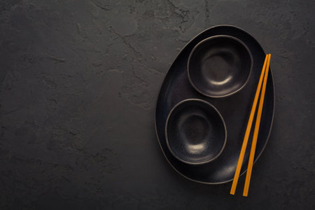 Empty plate, spoon and chopsticks on black table in asian restaurant, close up, top view. Table setting