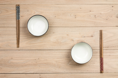Ceramic bowls and wooden chopsticks on the table before the start of the service in the Chinese restaurant