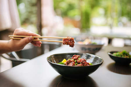 Selective focus on eating asian marinated chicken in a spicy sauce with chopsticks