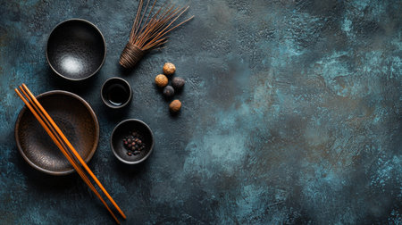 Flat lay of traditional Japanese ceramic bowls, chopsticks, and spices on a textured dark blue rustic background.