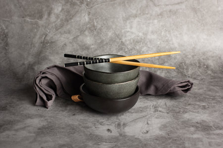 Black and gray bowls and chopsticks on a gray stone kitchen counter with copy space