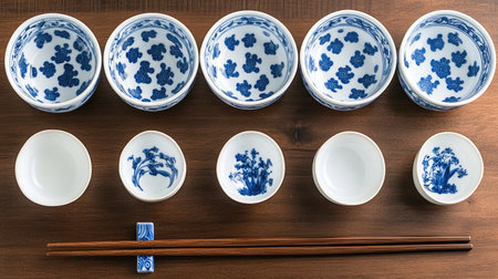 Discover a beautiful arrangement of blue and white porcelain dinnerware, featuring floral patterns and elegant chopsticks, perfect for any dining occasion.