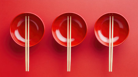 Three red bowls with chopsticks arranged neatly on a vibrant red surface, creating a striking visual for Asian dining experiences and minimalistic design.