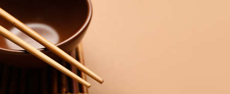 Chinese bowl and chopsticks on color background with space for text, closeup