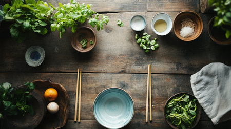 A stunning overhead view of a rustic wooden table showcasing fresh ingredients with bowls and chopsticks. Ideal for culinary inspiration and food presentation ideas.