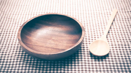 Wooden bowl and cutlery on wooden background or table. Natural serving table setting