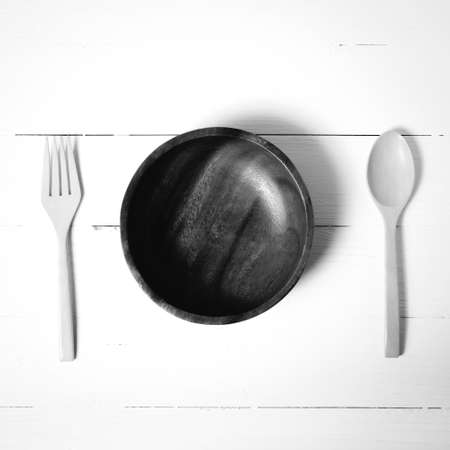 Wooden bowl and cutlery on white background. Natural serving table setting
