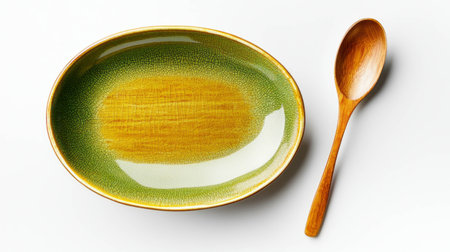 Realistic empty oval ceramic platter with elegant wooden spoon for dining decor