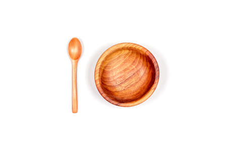 Top view of handmade empty wooden bowl with wooden spoon isolated on white background.