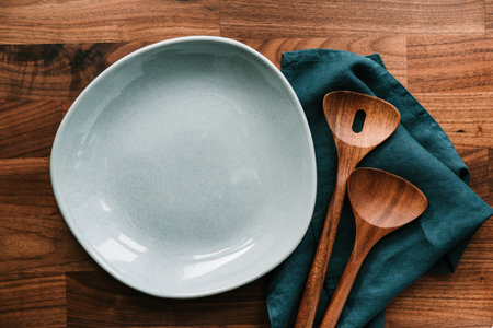 Empty ceramic plate for salad with wooden kutchen tools on a wooden table. Eco style home still life, top view.