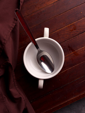 Empty bowl with spoon on a table in a restaurant, shallow depth of field
