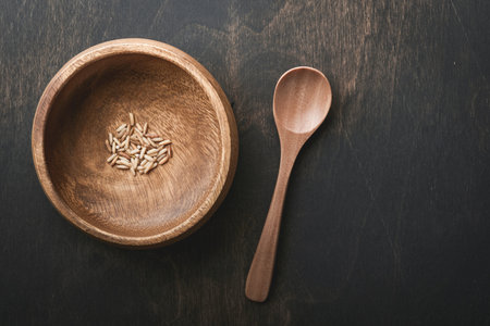 A white ceramic bowl and wooden spoon on a wooden table on dark background with copy space.