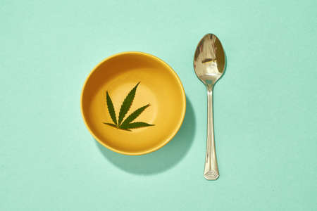 A minimalist design featuring an empty ceramic bowl and a spoon on a teal backdrop, perfect for use in culinary-themed projects or kitchen decor.