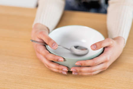 View from above.The hands of an old grandmother of 90 years are holding an empty aluminum bowl and spoon, poverty and poverty, the hunger of the older generation.