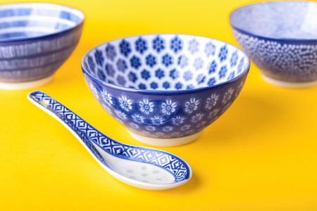 A set of tableware on a restaurant table, white bowls, black chopsticks and black spoon