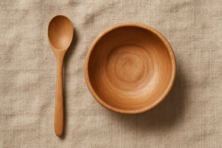 Wooden bowl and spoon set on a beige linen tablecloth, perfect for presenting food in a rustic and natural style