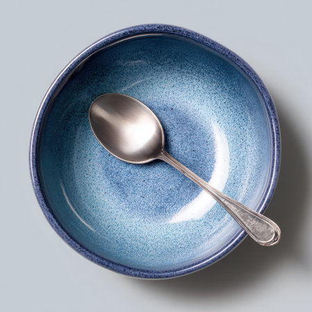 A delicate blue cereal bowl with subtle textures holds an empty spoon, reflecting light beautifully. This minimalist setup captures a moment of pause, inviting reflections on simpler breakfasts.
