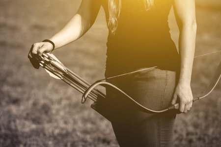Bow and arrow in the hands of a woman close-up on the background of a large stone