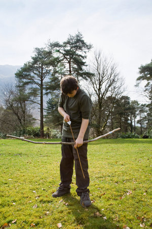 Archery. Man with a bow - close up view of a hands. Cropped image.