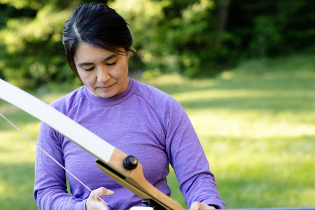 Archer close up, preparing the arrow for the shot, on white isolated background.