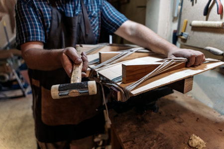 Unrecognized luthier working in traditional workshop making a guitar and using a hammer.