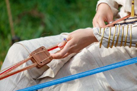 Person is sitting on the grass and making a piece of art. They are using a wooden frame and a blue and white string