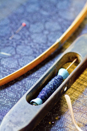 Hijab woman working with wool yarn and wooden hoop embroidery stand on table
