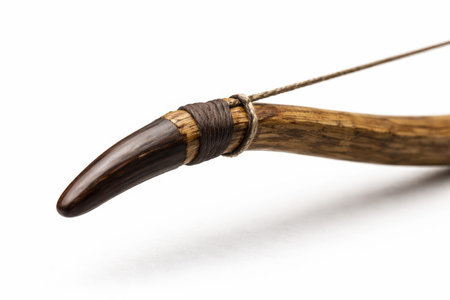 Professional studio closeup photo medieval wooden bow tip with horn nock and taut bowstring fine wood grain and tool marks sharp focus shallow depth isolated on white background