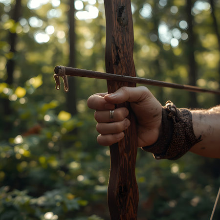 Archer prepares to release an arrow from a handcrafted bow amid tall trees, capturing the essence of traditional archery in a tranquil forest atmosphere.