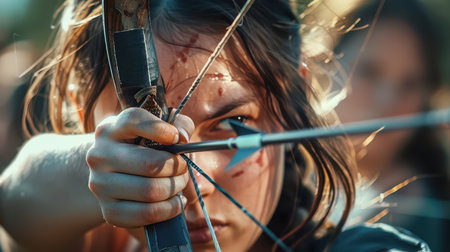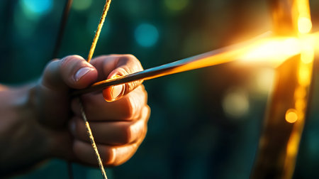 Archer s focused precision close up of hand drawing bowstring, embodying summer olympic spirit