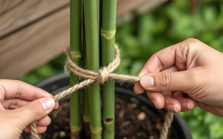 Close-up view of two hands tying green plant stems together with a thick, natural jute rope. The rope is knotted securely around the stems, which are upright and appear to be bamboo or a similar plant. The background is softly blurred, showing green foliage and a wooden surface.