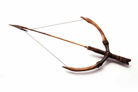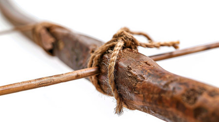 Medieval wooden recurve bow on stand with coiled string isolated on white background