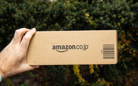 PARIS, FRANCE - NOV 15, 2018: Man holding the side of Amazon Japan prime cardboard delivery box parcel against outdoor green background - on-line e-commerce shopping