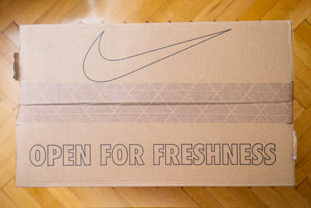 Paris France - Jul 7 2019: Above view unboxing unpacking sport running shoes equipment manufactured by Nike sportswear - open for freshness and icon of the brand