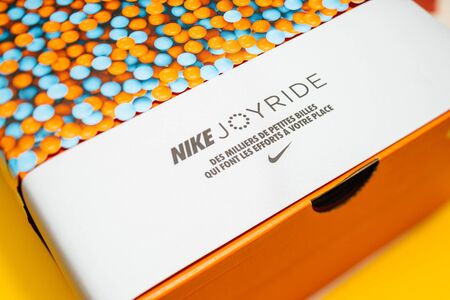 Paris, France - Jul 30, 2019: Close-up macro view of latest innovation from Nike Sports the Joyride running shoes - package isolated on yellow background