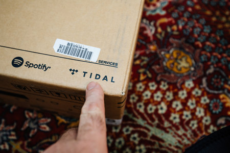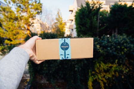 Paris, France - Nov 16, 2018: POV personal perspective male hand holding showing Amazon Prime cardboard with festive holiday scotch tape - defocused city background