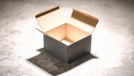 Open empty cardboard box on black background