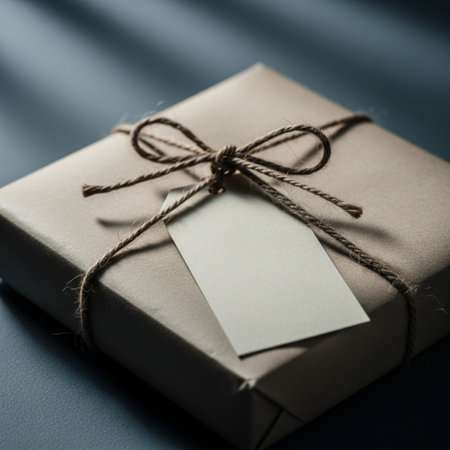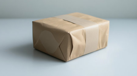 A beautifully wrapped brown paper package resting on a soft surface, showcasing minimalist design while emphasizing simplicity and elegance in shipping.