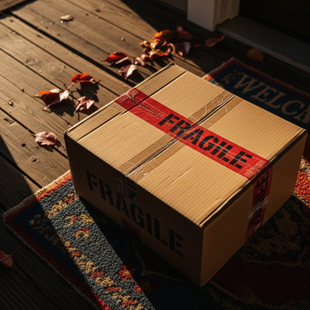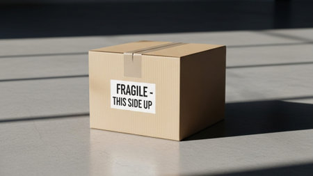A cardboard box with a fragile sticker rests on a clean surface. Soft light streams through nearby windows creating a calm setting for shipping.