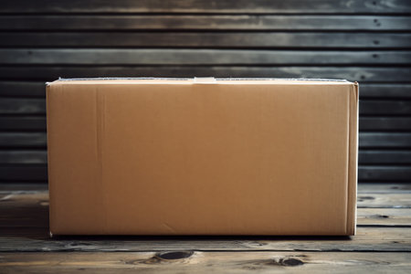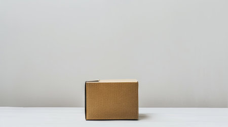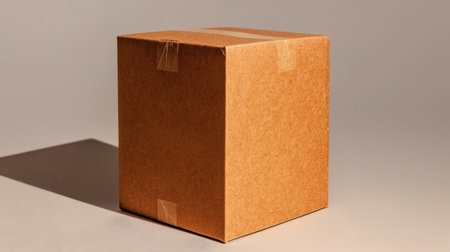Closed brown kraft cardboard box with tape, showcasing simple and clean design. box is positioned to create soft shadow, evoking sense of minimalism and functionality