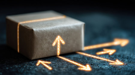 A simple brown cardboard box sits on a dark textured surface with glowing arrows around it, symbolizing delivery and movement, ideal for shipping and logistics themes.
