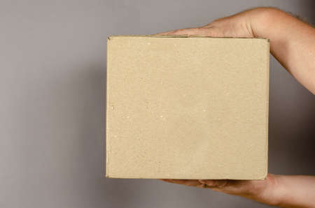 Two men's hands hold a square brown box. Side view. Space for text. Selective focus.